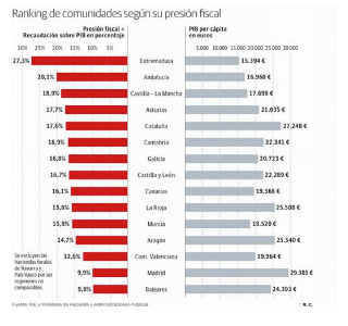 Una eficaz gestión de las arcas públicas madrileñas ha permitido a esta CCAA, contando con un presupuesto mucho menor que el de Cataluña, aplicar los tributos más bajos de toda España. La presión fiscal en Madrid es del 9,9% del PIB regional, con respecto a Cataluña: el 17,6% de su PIB.